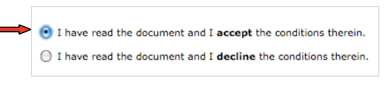 You will need to carefully read through the Terms and Conditions and accept or decline the conditions listed there. NOTE: If you decline the terms and conditions you will NOT be able to become a vendor for the agency.