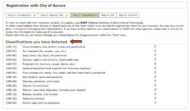 Step 3: Classification - Here you will be able to select the classification codes that match the bids you want to be notified about. Usually you will enter the classification codes under which your company falls.