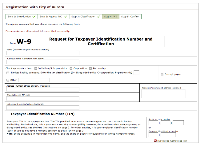 Step 4: W9 - This step will include any forms that the agency requires you fill out in order to work with them. This will usually include a W9 form, and any other tax information that they require. Simply enter your business' information in the required fields, or download the form(s) and send them back to the agency depending on the format they have listed on the site.