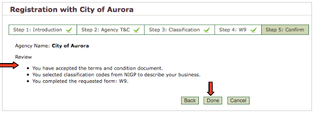 Step 5: Confirm - Here you will be asked to review all of the information you entered during the Agency Vendor Registration process. If everything is correct, click "Done" and you are ready to view and respond to bids from the agency!