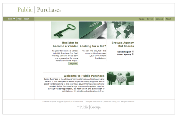 Registering to be a Public Purchase Vendor is fast, simple, and, best of all, FREE! Public Purchase is the best eProcurement system that connects government agencies to vendors across the nation. It was designed to connect vendors to the vast government and educational market. Public Purchase brings government buyers and vendors together through bid notifications. In order to register for free, go to www.publicpurchase.com. Free Registration is a TWO-PART process. First register with the website. Second register with the agencies you wish to work with.
