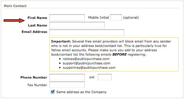 You will also be asked to enter your Main Contact's information. This is critical to your registration, as we will need to contact your company to verify your information in order to complete your registration.