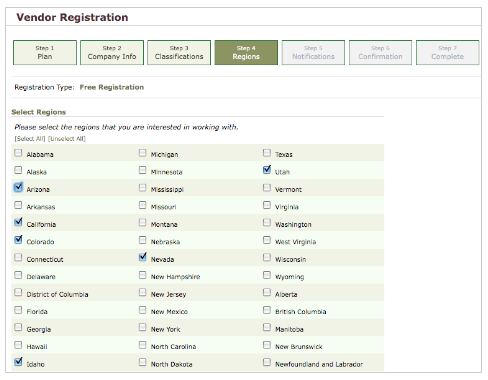 Step 4: Regions - In this area you will be asked to select all areas by state that you are willing to work. This could be nationwide, all states on the Eastern Seaboard, or simply the state where you are headquartered. Once you've selected the states where you're willing to work, click on the Next Step button at the bottom of the page.