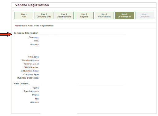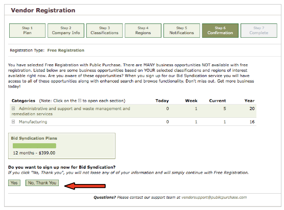 Step 6: Confirmation - You will now be directed to a Confirmation Page. You will be asked if you wish to complete your Free Registration, or if you want to sign up for our Bid Syndication. Click "No, Thank You" to complete your Free Registration.