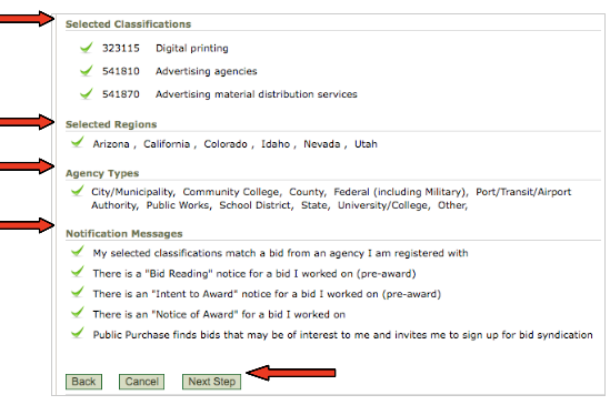 You will also need to verify your Classifications, Regions, Agency Types and Notification Messages. Once you are sure all is correct, click "Next Step" to complete your registration.
